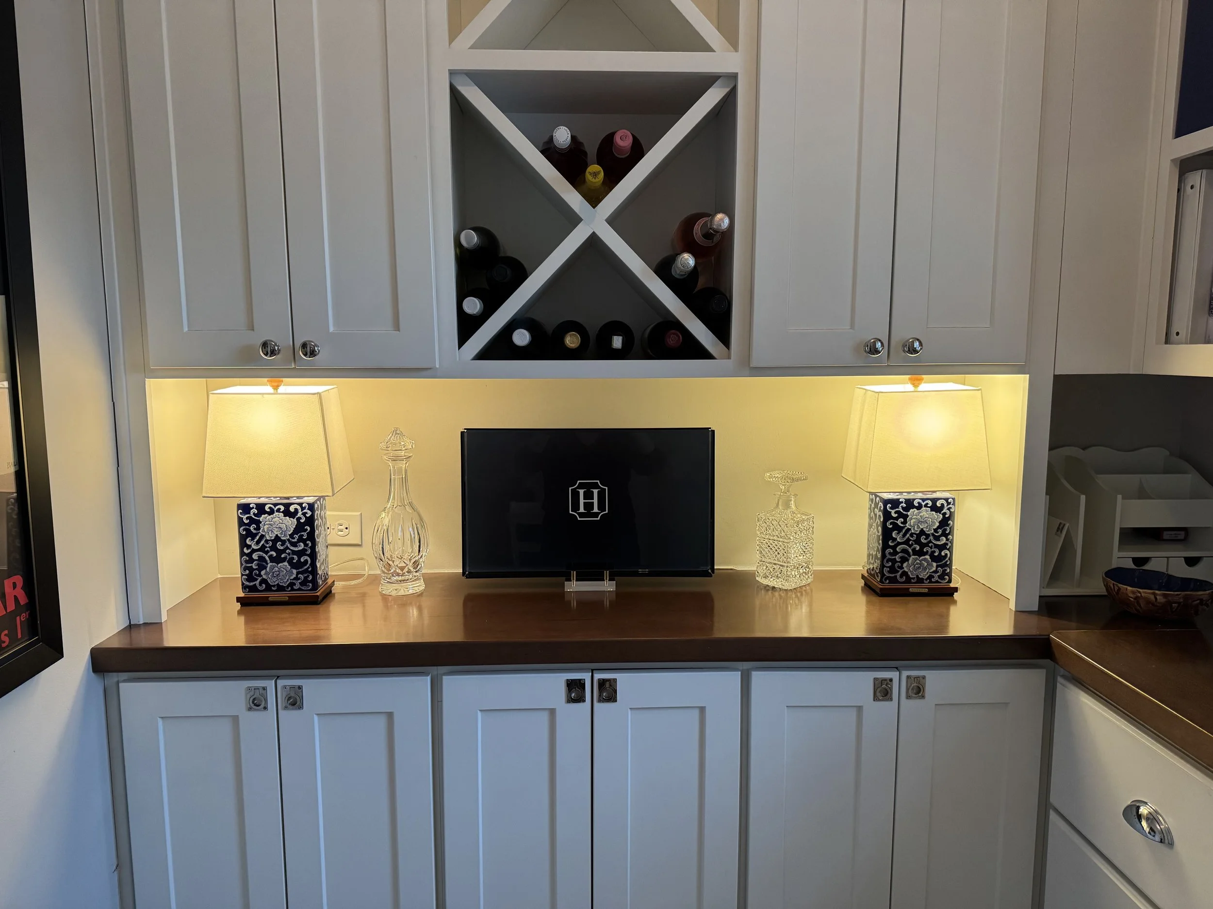 Custom built-in cabinetry establishes symmetry and architectural rhythm while dramatically increasing storage. A tailored L-shaped countertop expands prep and serving space, selected to coordinate seamlessly with the adjacent dining area and visually connect the home’s entertaining zones. The addition of a dedicated dry bar elevates the function further—with new cabinetry thoughtfully designed to house wine, spirits and cocktail glassware, keeping everything organized and beautifully within reach.