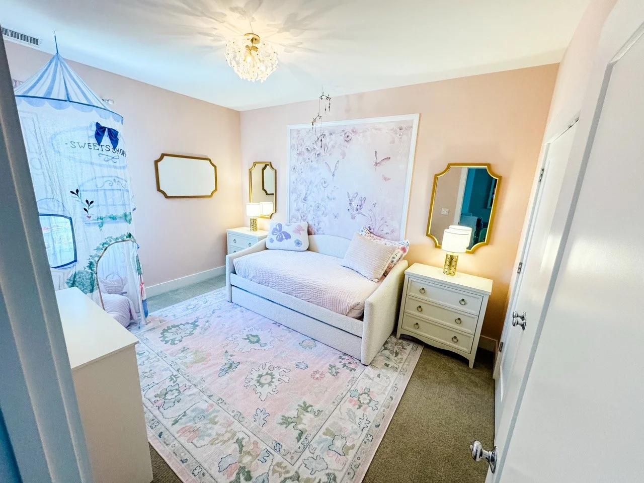 An upholstered daybed with a trundle provides both comfort and flexibility, while matching dressers flanking the bed serve as functional nightstands. Butterfly lamps and mirrors introduce symmetry and help reflect light, making the larger room feel even brighter and more open. Soft pink walls set a gentle foundation for layered details, including a whimsical mural, coordinating butterfly mobile and light fixture, and a play canopy paired with a dedicated bookshelf for quiet moments.